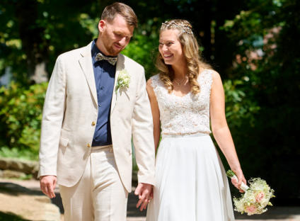 Sollte der Tagesablauf es zulassen, rate ich meinen Brautpaaren dazu, das Brautpaarshooting schon vor der Trauung zu machen.Die Vorteile hierbei sind, dass das Make-up noch frisch ist, Ihr nochmal - vielleicht zum letzten Mal an diesem Tag - Zeit zu zweitverbringen und genießen könnt und Ihr nach der Trauung mehr Zeit mit Euren Gästen habt.